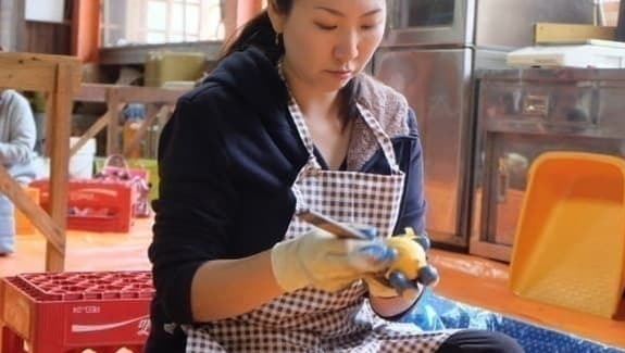 日本唯一の燻製法、今庄つるし柿。1つずつ皮を向いて丁寧に作っていきます。