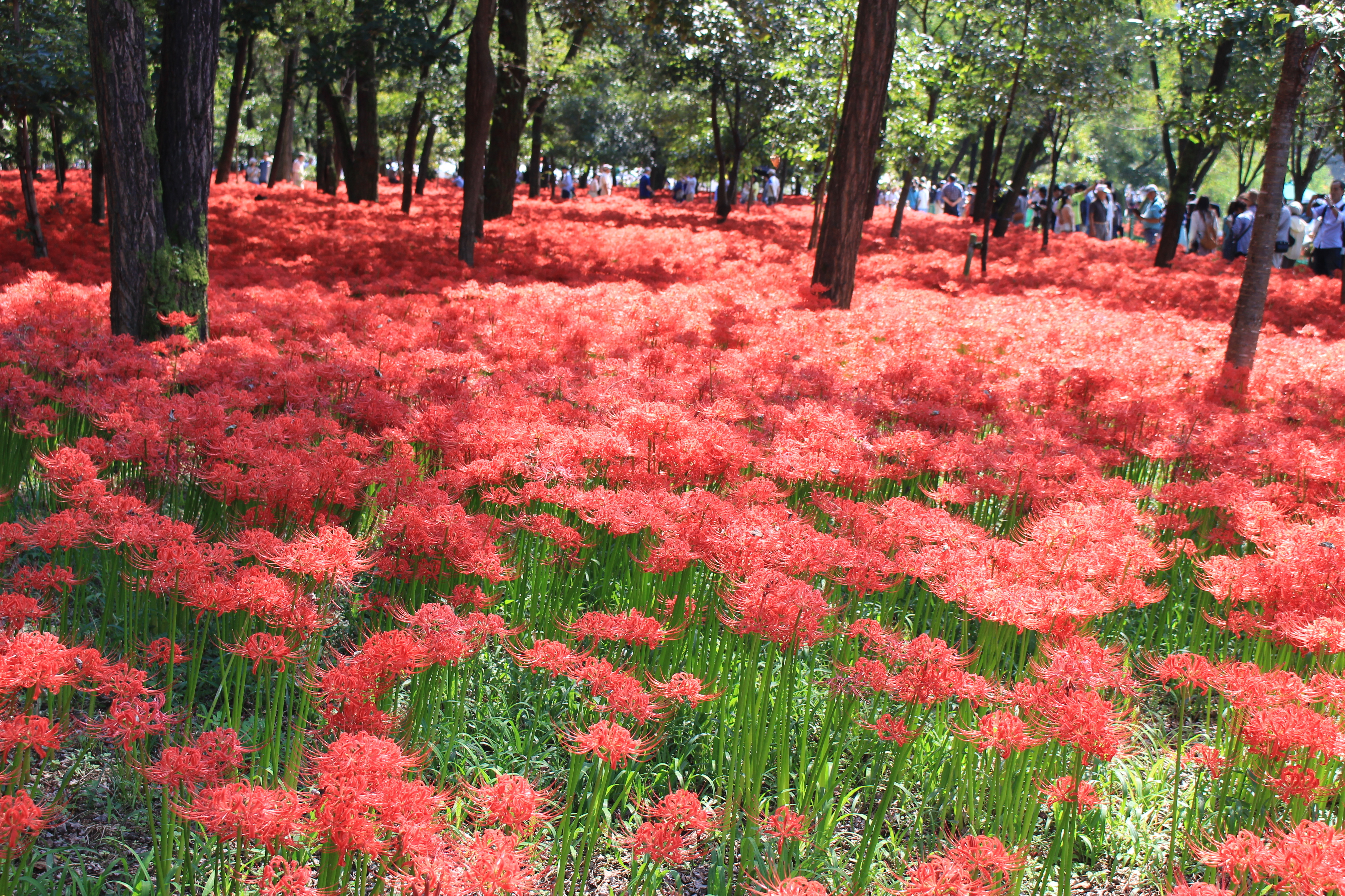 曼珠沙華は天界に咲く赤い花を表す梵語。秋の彼岸の前後に、田畑の畦や土手に咲くヒガンバナ科の多年草で群生します。昔から日本全土で普通に見られますが、在来種ではなく、中国から渡来した外来種とされているようです。巾着田の彼岸花は、高麗川の上流から流された球根が蛇行した地形に沿って自生しており、その数は500万本、日本最大級の群生地と言われています。